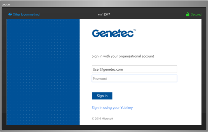 - Kullanıcı adınızı ve etki alanınızı girdiyseniz, Parola alanına tıklayın veya Sekme tuşuna basın. Security Center, etki alanınızda web tabanlı kimlik doğrulamasının etkinleştirildiğini algılarsa, bir web formuna yönlendirilirsiniz. Aşağıdaki ekran görüntüsü bir örnektir. Oturum açma sayfanız farklı görünebilir.